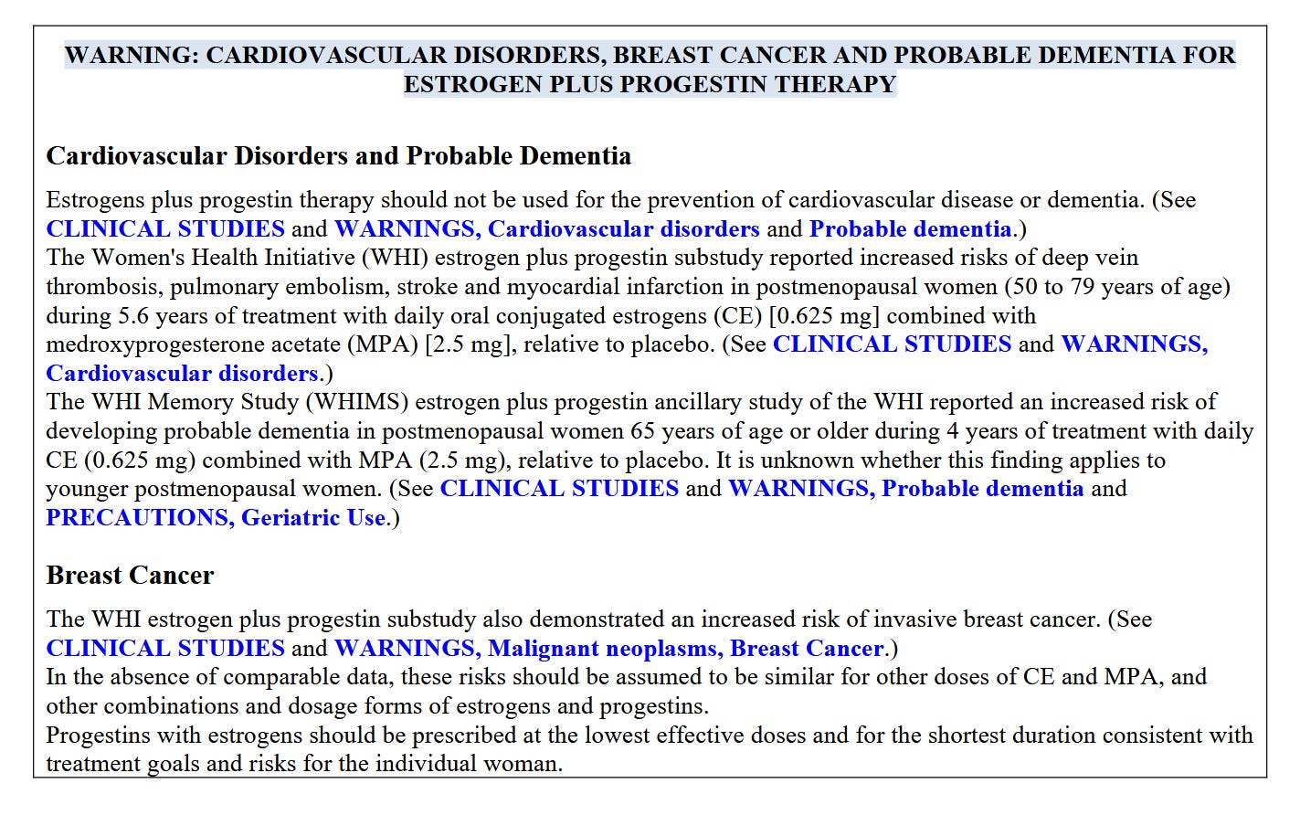 The black box warning was added in 2003, prompted by early results from the Women’s Health Initiative, or WHI. One arm of this massive research endeavor by the National Institutes of Health was the largest ever randomized controlled trial of “hormone replacement therapy,” as it was called in the late 90s, when the trial began. More than 27,000 post-menopausal women were split into two groups, one group given placebo and one group given the standard treatment at the time, a combination of conjugated equine estrogen (yes, derived from horses’ urine) and medroxyprogesterone acetate, a synthetic progestin. A subgroup of women who’d lost their uteri took estrogen only.